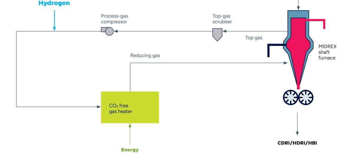 If hydrogen is to be used as the sole reductant permanently, the natural-gas reformer can be replaced by a reduction-gas heater. H2 will be converted to H2O during reduction and condensed in the top-gas scrubber. Since there is no source of carbon monoxide in the process loop, there is no need for a CO2 removal system. The process uses approximately 550 Nm³ of hydrogen per ton of DRI for reduction. Additionally, it requires about 250 Nm³ of H2 per ton of DRI for heat, which can be accommodated by other energy sources.