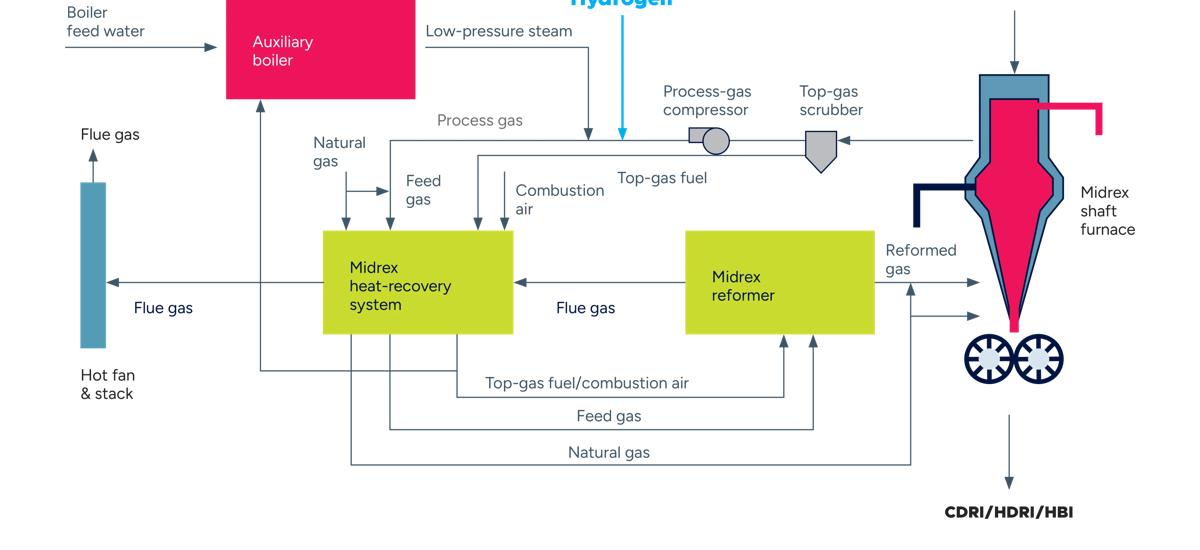 MIDREX direct-reduction plants produce roughly 60 percent of the world's DRI and have been available from Primetals Technologies for more than 30 years. The reducing gas—mainly a mixture of H2 and CO—is produced from natural gas in a special CO2 reformer supplied by Midrex Technologies. Without any modifications to the equipment, the process allows up to 30%of the natural gas is to be replaced by hydrogen. To take an example, 60,000 Nm³/h of hydrogen could be brought in to substitute 20,000 Nm³/h of natural gas in the process. With minor additions to the equipment (to protect the reformer), the rate can reach as high as 100 percent—the limit may be determined by the required carbon content in the final product. The process can easily accommodate fluctuations in the hydrogen-addition rate, allowing the plant to react to changing hydrogen supplies (which are to be expected when sourcing the gas from water electrolysis with renewables like wind or solar).