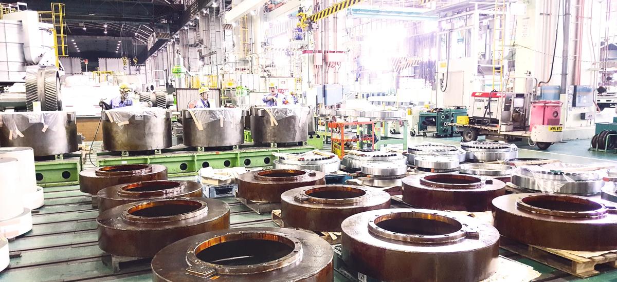 One product type that could be called a "specialty" of the workshop is the housings for hot-strip mills, which are not forged but welded. They feature an outstanding price-performance ratio. Crafting these housings requires extreme precision, because the surface must be absolutely even. For this reason, the Hiroshima workforce is distinctly proud of this product category. Other products constructed at the Hiroshima workshop include sizing press crank shafts and main gear boxes for width reduction, components for the main cylinders of cold-strip mills, and inner housings for HZ mills.
