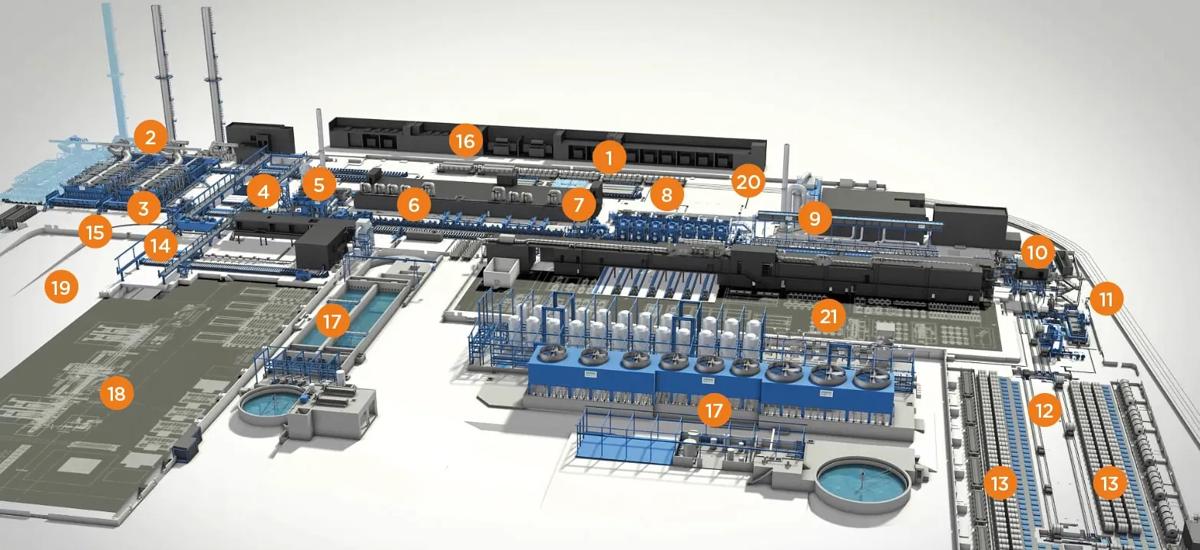 The HRPF project scope for Primetals Technologies included engineering, manufacture of special components, and the supply, installation and commissioning of mechanical equipment as well as electrical and automation systems. The scope of supply covered transfer and handling equipment for slabs and ingots; heating/reheating furnaces; primary and secondary descalers; slab and rotary crop shears; a 4-high reversing roughing stand with an integrated heavy edger; heat-retention Encopanels; a 7-stand, 4-high finishing train; a laminar-cooling section; two Power Coilers with integrated pinch-roll polishers and quick-exchange pinch-roll units; a coil-handling system; integrated sampling, inspection, marking and strapping machines; fume-exhaust systems; and a water- treatment plant. The electrical and automation systems comprised the main and auxiliary motors, drives, instrumentation, basic automation, process automation, the Siloc yard-management system and a manufacturing execution system (MES). The general layout of the HRPF is depicted in Figure 2.
