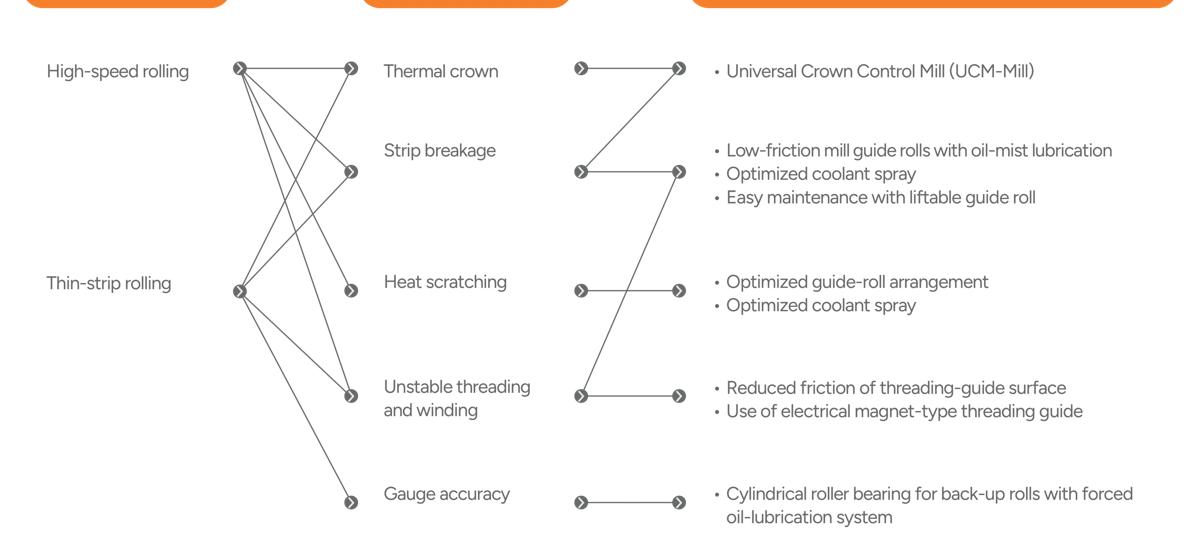 Heat scratches caused by insufficient lubrication and cooling place limits on rolling capability with respect to rolling speed and strip-thickness reductions, yet high rolling speeds and heavy-gauge reductions are a prerequisite for steel produced for tinplate application. Thin-gauge rolling also increases the frequency of strip breakage. High-speed stable rolling with high-quality rolling results is achieved by optimizing the roll-coolant flow rate at each stand and for each strip-cooling zone. Oil-mist lubrication is also applied instead of grease-packed mill guide-roller bearings in order to reduce bearing friction. Accordingly, a secured and stable roll rotation during rolling-speed acceleration and deceleration with reduced strip tension prevents scratches between roll and strip surfaces. Liftable mill guide rolls are also installed to shorten handling time in case of strip breakage.