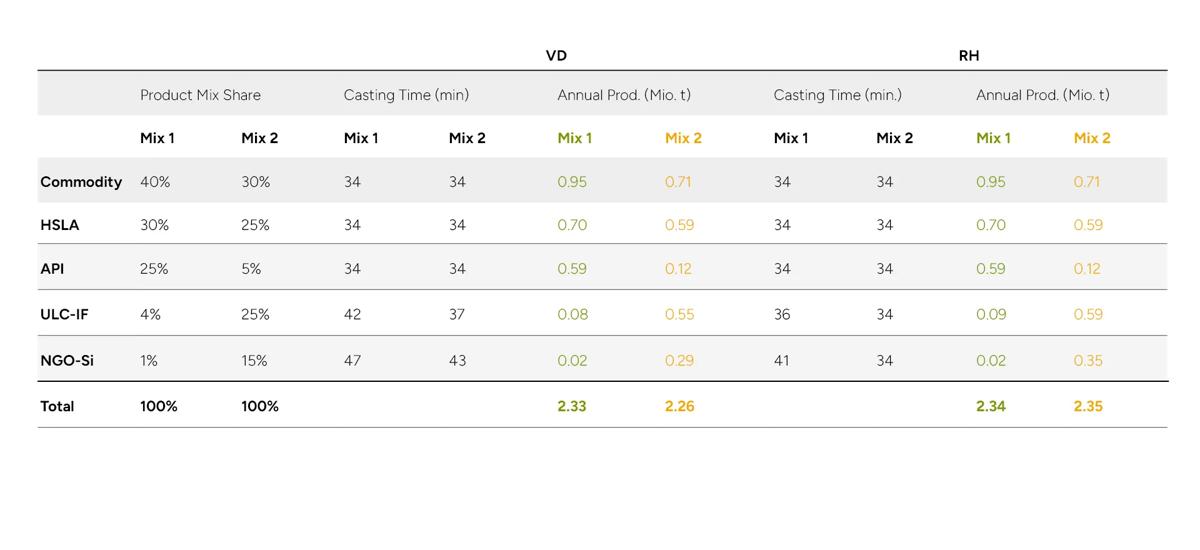Experts concluded that to maintain even a diverse product mix, additional secondary treatment units, including VD and RH units, are required to meet the desired casting schedule. For a producer casting a variety of steel grades, from commodity to NGO-Si, two twin VD stands and RH units would be required to meet the casting schedule and maintain annual productivity. With experience in both greenfield and brownfield supply and construction, specialists at Primetals Technologies have delivered secondary metallurgy solutions to producers worldwide that fit the specifications and footprint of existing plants. Moreover, patented technologies, such as the Combined Vessel and Ladle Lifting System, expedite degassing procedures in RH units.