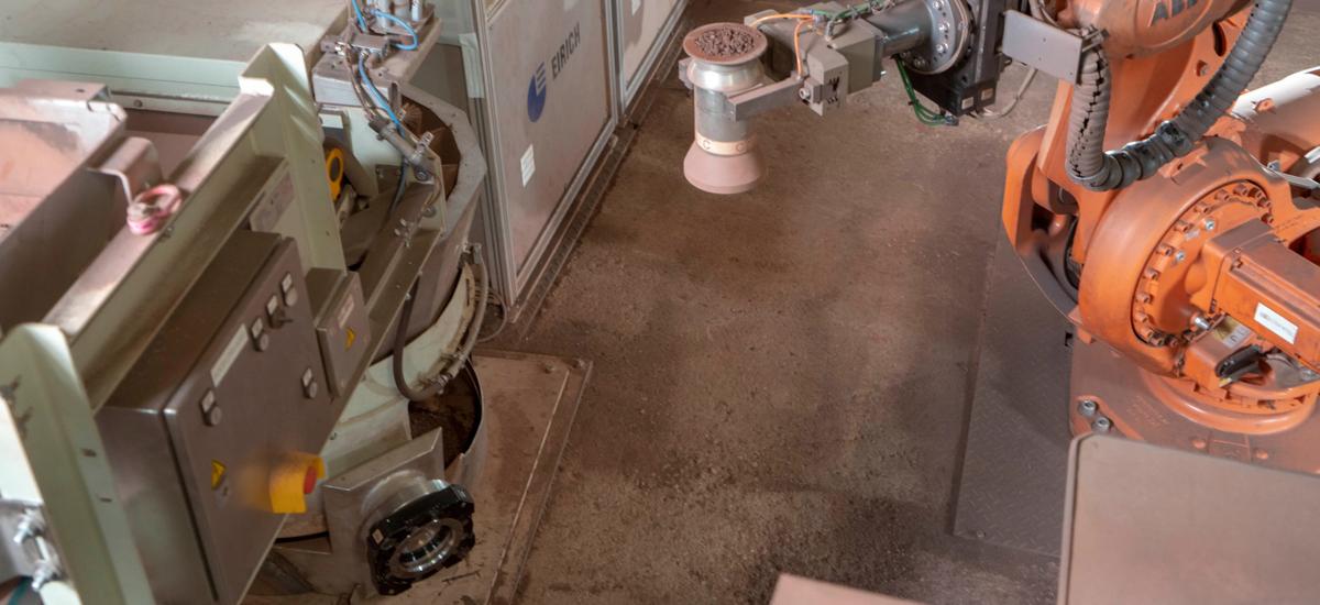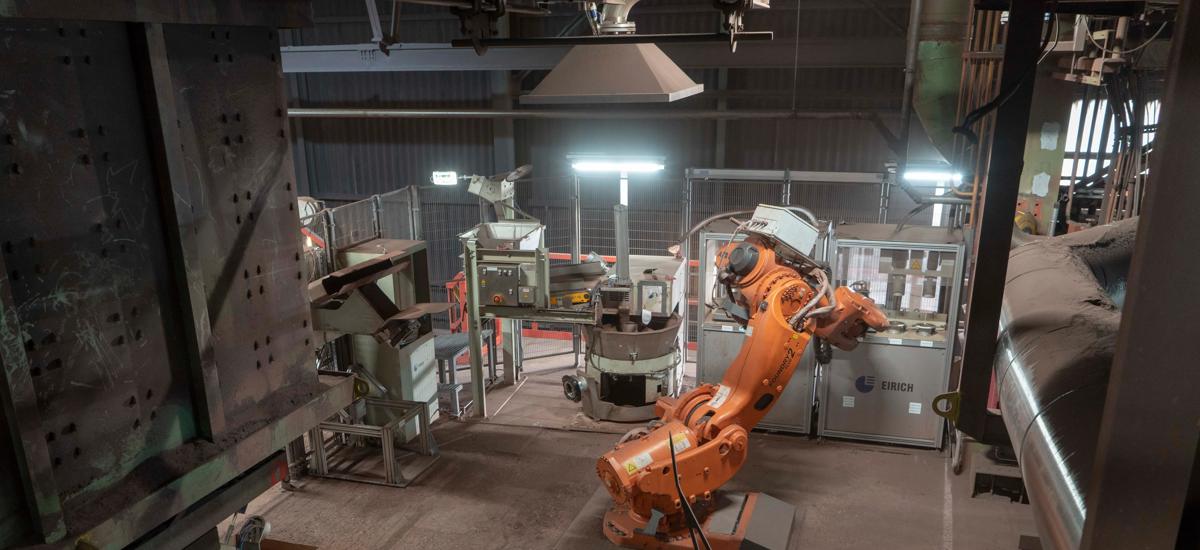 To take a representative sample, the robot first picks up a vessel from a tool-changing system and holds it into the material stream for filling. Then the material is fed into a rotary divider to fill several cups with screen bottoms. These cups are transferred to measuring stations where the raw mix is first weighed to calculate bulk density and then tested for gas permeability and moisture. Air is drawn through the cups to obtain the necessary values of pressure drop and volume-flow rate for permeability. Additional measuring stations can be easily added, and an operator can request additional sample cups for outside laboratory testing to be put onto the turntable of a security gate.