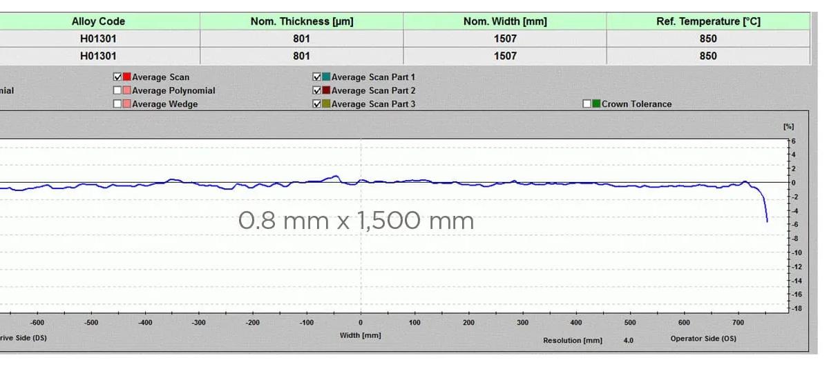 In an Arvedi ESP line, crown and wedge s­haping takes place in the high-reduction mill, directly after the caster, when the core of the strand is hotter and thus easily ­formable. This setup enables full control to form the final shape. End customers can order products with C40 target-crown values of as little as 1% of the strip’s thickness. Also, flat target crowns can be produced as shown in the graph. This allows for the slitting of narrow cold-band-substitute products while retaining a good symmetric crown without compromising wedge-related issues at downstream aggregates. The figure above shows the strip profile of a 0.8-millimeter strip with remarkable consistency in terms of strip shape.