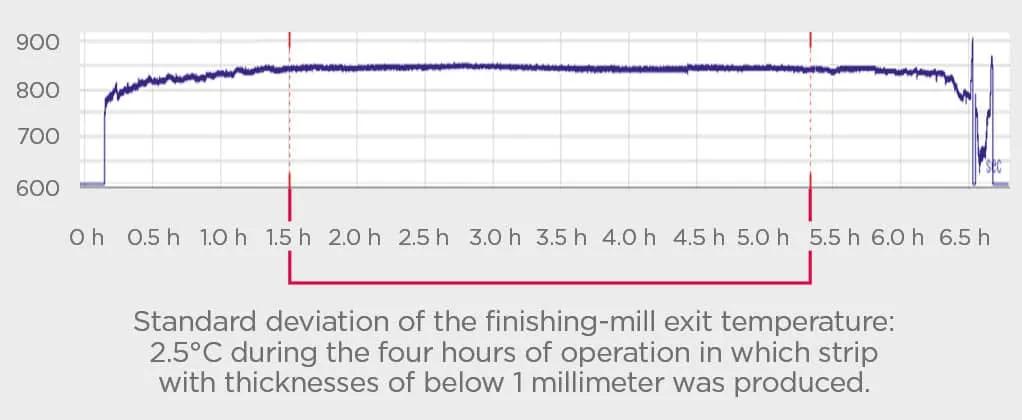 The high temperature stability achieved by Arvedi ESP is reflected in constant product speeds and temperature profiles through all process steps, from casting and roughing to inductive reheating, finishing rolling, and strip cooling. Speed-ups known from conventional hot rolling are completely omitted, leading to products of more consistent quality. The figure above shows a sequence in which a high percentage of thin and ultra-thin gauges were manufactured. It reflects more than four hours of production of strip with thicknesses below 1.0 millimeters. During this period, the standard deviation of the temperature at the finishing-mill exit was 2.5°C. The contour and crown was stable even over such long sequences, which made the production of a high percentage of thin and ultra-thin gauges possible.